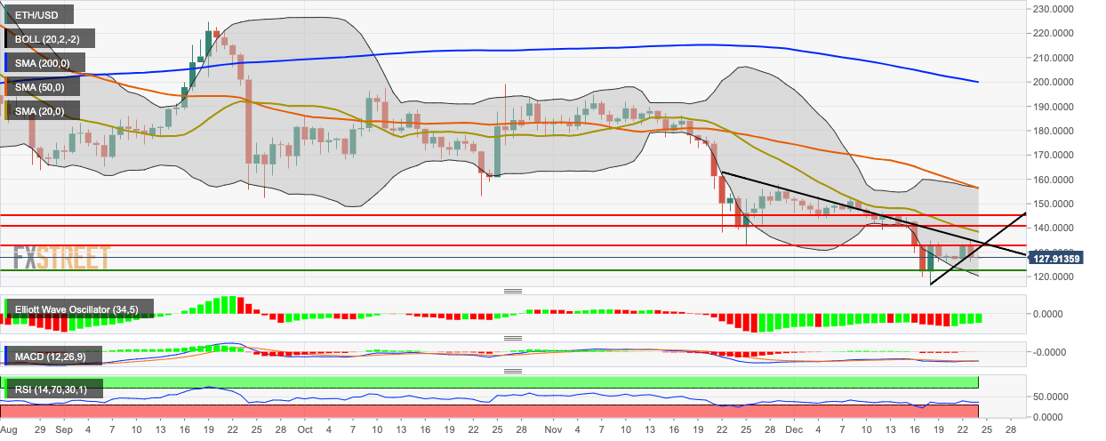 ETH/USD is on course of charting two consecutive bearish days. The price fell from $132.50 to $128 this Monday and has fallen further to $127.80. In the process, Ethereum dropped below the triangle formation. The bulls must overcome resistance at the downward trending line and the 20-day Simple Moving Average (SMA 20) curve.