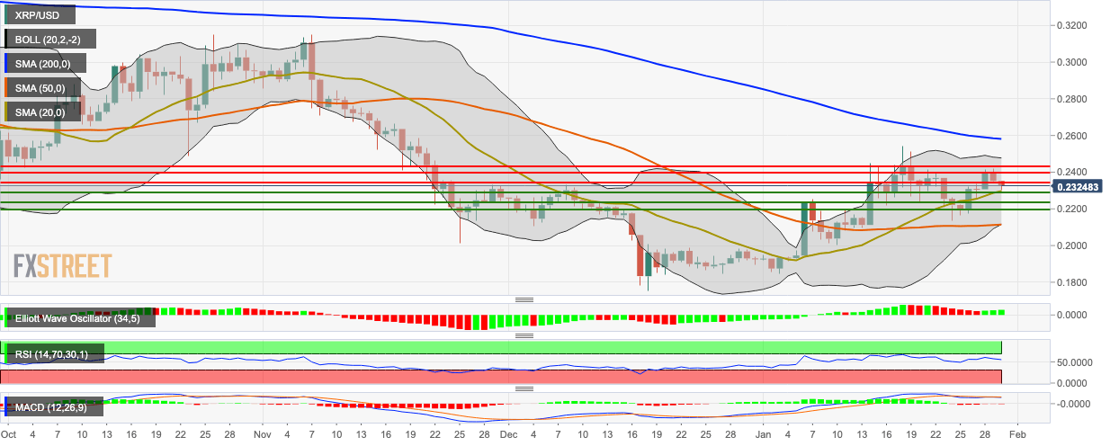 XRP/USD bears took control of the market for the second day in a row. This Wednesday, the price went down from $0.239 to $0.235 and it has fallen further to $0.233 in the early hours of Thursday. The SMA 20 curve acts as immediate market support and the 20-day Bollinger Band is constricting.