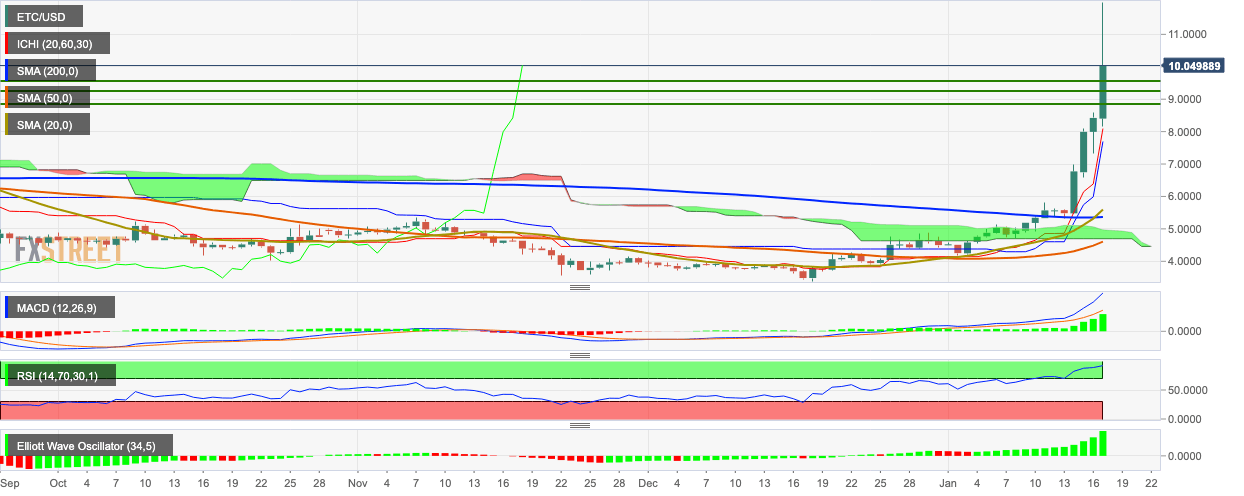 ETC/USD bulls retained their overwhelming control over the market for the fourth straight day as the price went up from $8.40 to $10 this Friday, including an intra-day high of $12. In the process, it reached its highest price level since October 2018. Over the last four days, ETC/USD spiked from $5.45 to $10, charting an 83.5% rise in price.